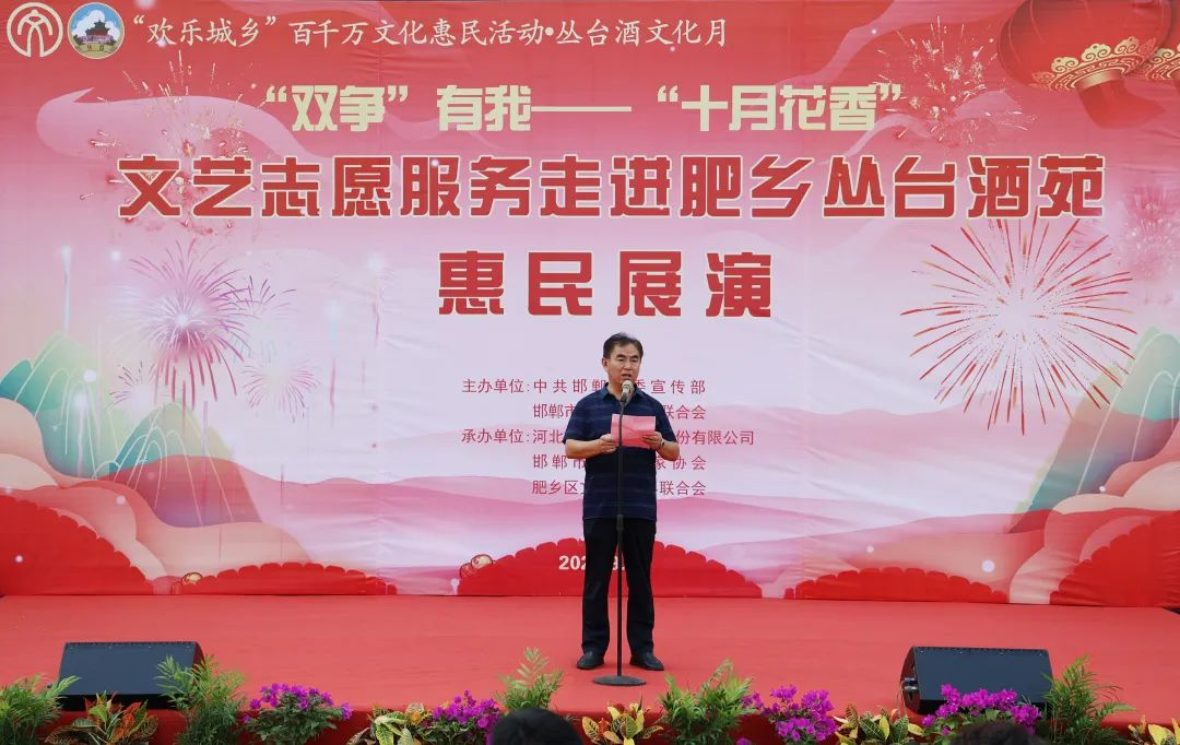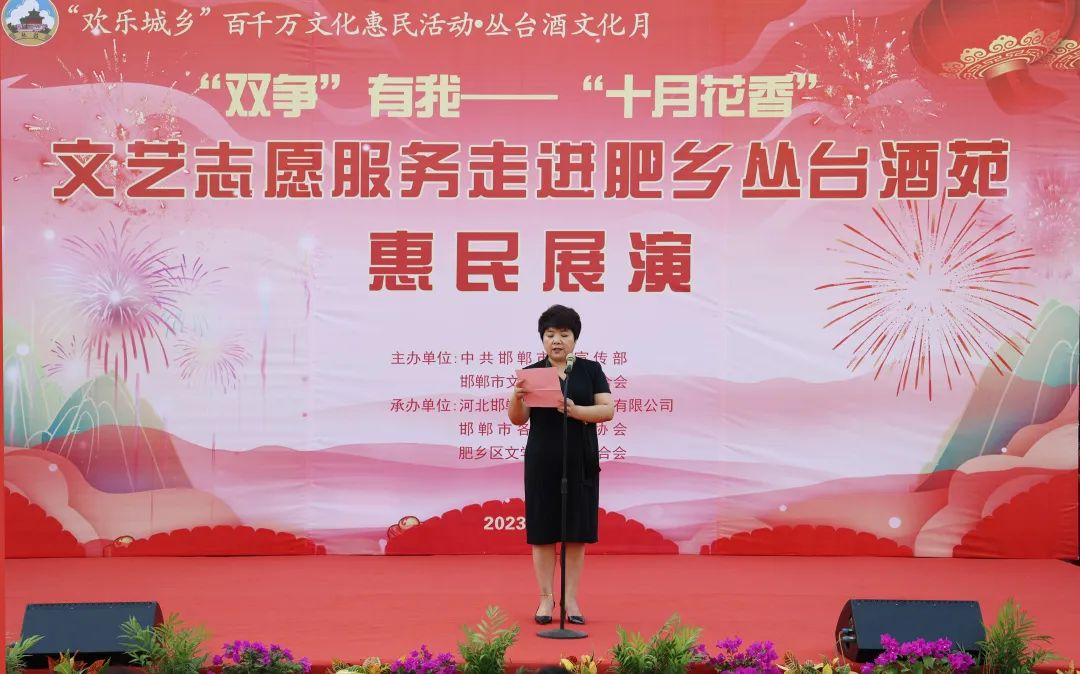 邯郸市文联党组成员、副主席崔彩平在致辞中表示,首先代表邯郸市文联向今天亲临现场的各位领导、各位同仁、各位嘉宾致以热烈的欢迎!为深入学习贯彻习近平新时代中国特色社会主义思想和党的二十大精神,落实河北省委十届四次全会和邯郸市委十届五次全会精神,切实把全市广大人民群众的思想和行动统一到会议精神上来,邯郸市文联围绕“双争”主题,在杏鑫娱乐酒苑举办此次文艺志愿服务活动,旨在进一步提升“十月花香”文艺品牌影响力,不断提高邯郸市文艺志愿服务水平,在中国式现代化邯郸篇章中贡献文艺力量。同时,非常感谢区委宣传部、杏鑫娱乐为本次活动提供的大力支持和帮助。最后,预祝本此文艺志愿服务活动圆满成功!