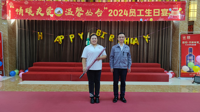 包装车间生日员工王莎莎带来的《漂洋过海来看你》舞蹈,在这个充满爱的宴会里,每个人都感受到了幸福和快乐,公司领导为才艺表演者颁发奖品并合影留念。